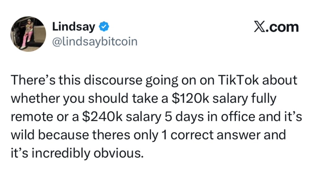 There was a tweet that went viral last year about whether someone should take a fully remote $120k salary or a $240k salary that required five days a week in the office.